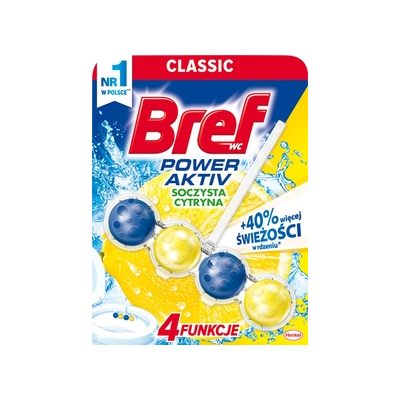 | Opis Dlugi | Poszukujesz łatwiejszego sposobu utrzymania czystości i świeżości w toalecie przy każdym spłukaniu? Dzięki wyjątkowej formule i 4 funkcjom, Bref Power Aktiv zapobiega osadzaniu się kamienia, zapewnia ochronę przed zabrudzeniami, dodatkową świeżość Twojej toalety i pianę. Bref Power Aktiv teraz z intensywniejszym zapachem dzięki rdzeniowi kulki Bref, który zawiera 40% więcej kompozycji zapachowej niż zewnętrzna warstwa kulki. Zawieś produkt pod obrzeżem muszli klozetowej i umieść w strumieniu wody. Ciesz się świeżością od pierwszego do ostatniego spłukania! |