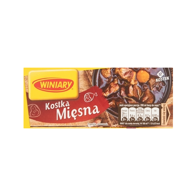 | Opis Dlugi | Kostka Mięsna Winiary idealnie podkreśli smak i aromat mięs, jednocześnie tworząc je soczystymi i niezwykle smacznymi. Dzięki niej masz pewność, że danie będzie smakowało Tobie i Twojej rodzinie. Kostkę mięsną możesz wykorzystać zarówno do podkreślenia smaku mięsnych zup, jak również sosów, które nabiorą odpowiedniej gęstości i koloru. Możesz ją również wykorzystać do przygotowania pieczeni i innych potraw mięsnych. Aby uzyskać intensywny smak mięsa rozpuść 2 kostki w 1 litrze wrzącej wody lub po prostu wkrusz kostkę do przygotowywanego dania. Kostka Mięsna Winiary to: - gwarancja, że danie zawsze się uda - idealnie przyprawione danie - intensywny i idealnie zbalansowany smak mięsa - prosty i szybki sposób na podkreślenie smaku i aromatu przygotowywanej potrawy |