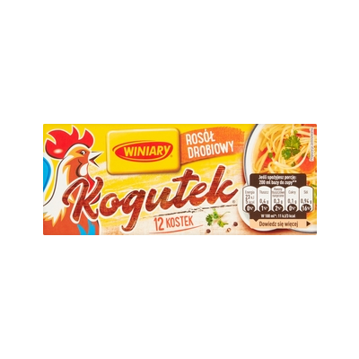 | Opis Dlugi | Bulion Drobiowy Kogutek od Winiary doskonale podkreśli smak i aromat Twoich dań. Dzięki niemu masz pewność, ze danie będzie smakowało Tobie i Twojej rodzinie. Możesz wykorzystać go zarówno do podkreślenia smaku zup, jak również do doprawienia innych potraw. Aby uzyskać esencjonalny bulion drobiowy Kogutek rozpuść 2 kostki w 1 litrze wrzącej wody, do podkreślenia smaku użyj jedynie 1 kostkę na 1 litr płynu. Przy użyciu kostki bulionowej większość dań nie wymaga dosalania, dzięki czemu masz pewność, że danie będzie udane i smaczne. Bulion Drobiowy Kogutek od Winiary: - gwarantuje, ze danie zawsze się uda - podkreśli smak nie tylko ulubionego rosołu - to znany, lubiany smak |