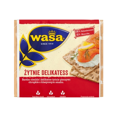 | Opis Dlugi | Bardzo cienkie i delikatne żytnie pieczywo chrupkie o klasycznym smaku. Odkryj Wasa Delikatess, nasze cieniutkie i chrupiące żytnie pieczywo chrupkie o klasycznym smaku. Dobrze komponuje się z każdym rodzajem dodatków, więc możesz dać upust swojej kreatywności! |