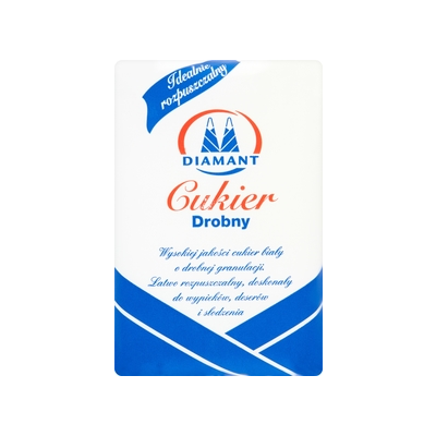 | Opis Dlugi | Cukier biały Diamant drobny to wysokiej jakości cukier biały o drobnej granulacji. Szybko się rozpuszcza, dzięki czemu doskonale nadaje się do pieczenia delikatnych ciast i biszkoptów. Jest również niezastąpiony przy wyrobie kremów, ubijaniu śmietany, piany z białek, słodzeniu zimnych napojów, świeżych owoców, sałatek owocowych oraz deserów. Doskonały także do zamrażania owoców. Pakowany w mocną, papierową torbę 1 kg. |