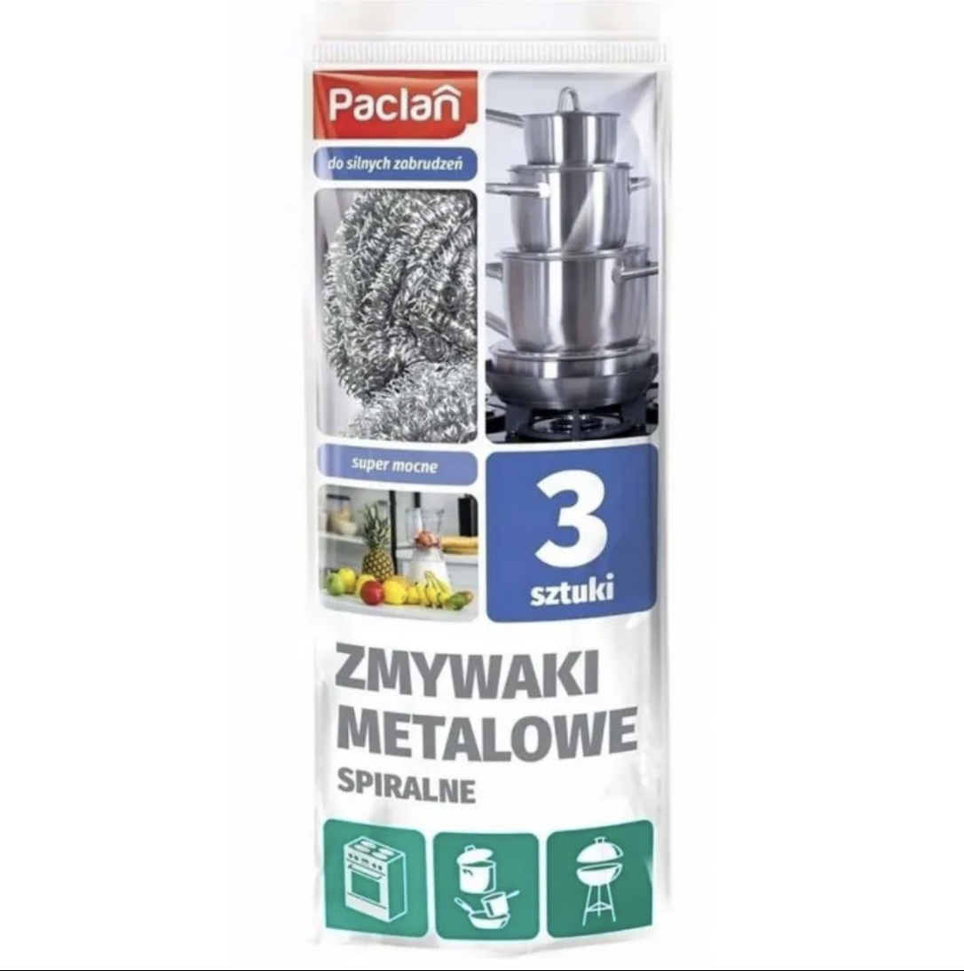 Zestaw spiralnych druciaków kuchennych marki Paclan przeznaczonych do skutecznego usuwania trudnych zabrudzeń. Idealne do czyszczenia garnków, patelni oraz powierzchni odpornych na zarysowania. Wytrzymałe i wydajne w codziennym użytkowaniu. Opakowanie zawiera 3 sztuki.