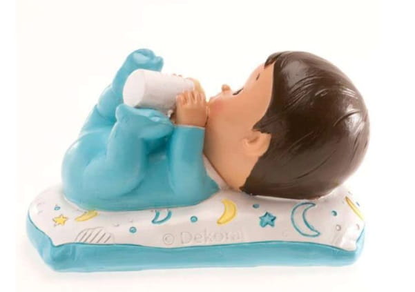 Wysokiej jakości piękna figurka na tort przedstawiająca niemowlaka pijącego mleko z butelki. Taka figurka to świetny dodatek dekoracyjny tortu z okazji Chrztu chłopca lub na Baby Shower. Figurka została wykonana z poliresinu, jest elegancka i pięknie zdobiona.