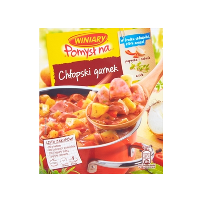 | Opis Dlugi | Winiary Pomysł Na… Chłopski garnek to propozycja na codzienny i sycący obiad dla całej rodziny inspirowany kuchnią polską. Do jego przygotowania potrzeba ulubionych polskich składników: ziemniaków, kapusty, kiełbasy i papryki. Dzięki aromatycznej mieszance suszonych warzyw i przypraw danie jest doskonale przyprawione. W połączeniu z świeżymi warzywami może być częścią zbilansowanego i wartościowego posiłku. Doskonały posiłek będzie gotowy w 30 minut! Wystarczy pokrojone składniki lekko podsmażyć, a następnie dodać Pomysł na… Chłopski garnek wymieszany z zimną wodą. Następnie całość zagotować i dusić przez 25 minut. Co wyróżnia Winiary Pomysł Na… Zapiekankę makaronową z serem: - Idealny sposób na urozmaicenie codziennego menu - Sycący obiad dla całej rodziny - Smaczne i doskonale przyprawione danie w 30 minut - Doskonała konsystencja i doprawienie gwarantowane przez Winiary |