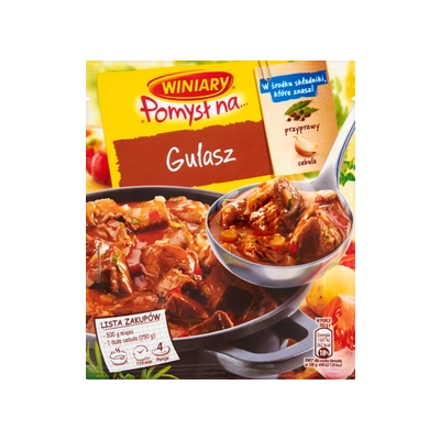 | Opis Dlugi | Winiary Pomysł Na… Gulasz to propozycja na urozmaicenie Twojego codziennego menu. Dzięki kompozycji suszonych warzyw i aromatycznych przypraw danie jest doskonale doprawione. Idealny posiłek będzie gotowy w 80 minut. Wystarczy podsmażyć pokrojone w kostkę mięso i dodać Pomysł na… Gulasz wymieszany z zimną wodą. Następnie całość zagotować i dusić przez godzinę. Dodając swoje ulubione dodatki i świeże warzywa możesz stworzyć pełnowartościowy i smaczny posiłek dla całej rodziny. Co wyróżnia Winiary Pomysł Na… Gulasz: - Smaczne danie gotowe w niewiele ponad godzinę - Mięso przygotowane w aromatycznym sosie - Doskonała soczystość i doprawienie gwarantowane przez Winiary - Idealny sposób na urozmaicenie codziennego menu |