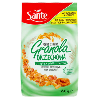 Granola orzechowa Sante to wieloskładnikowa i pożywna przekąska. Idealne śniadanie dla zabieganych, którzy pospiesznie wypadają rano z domu. A także dla wielbicieli mieszanek orzechów, migdałów, kokosa i płatków owsianych.