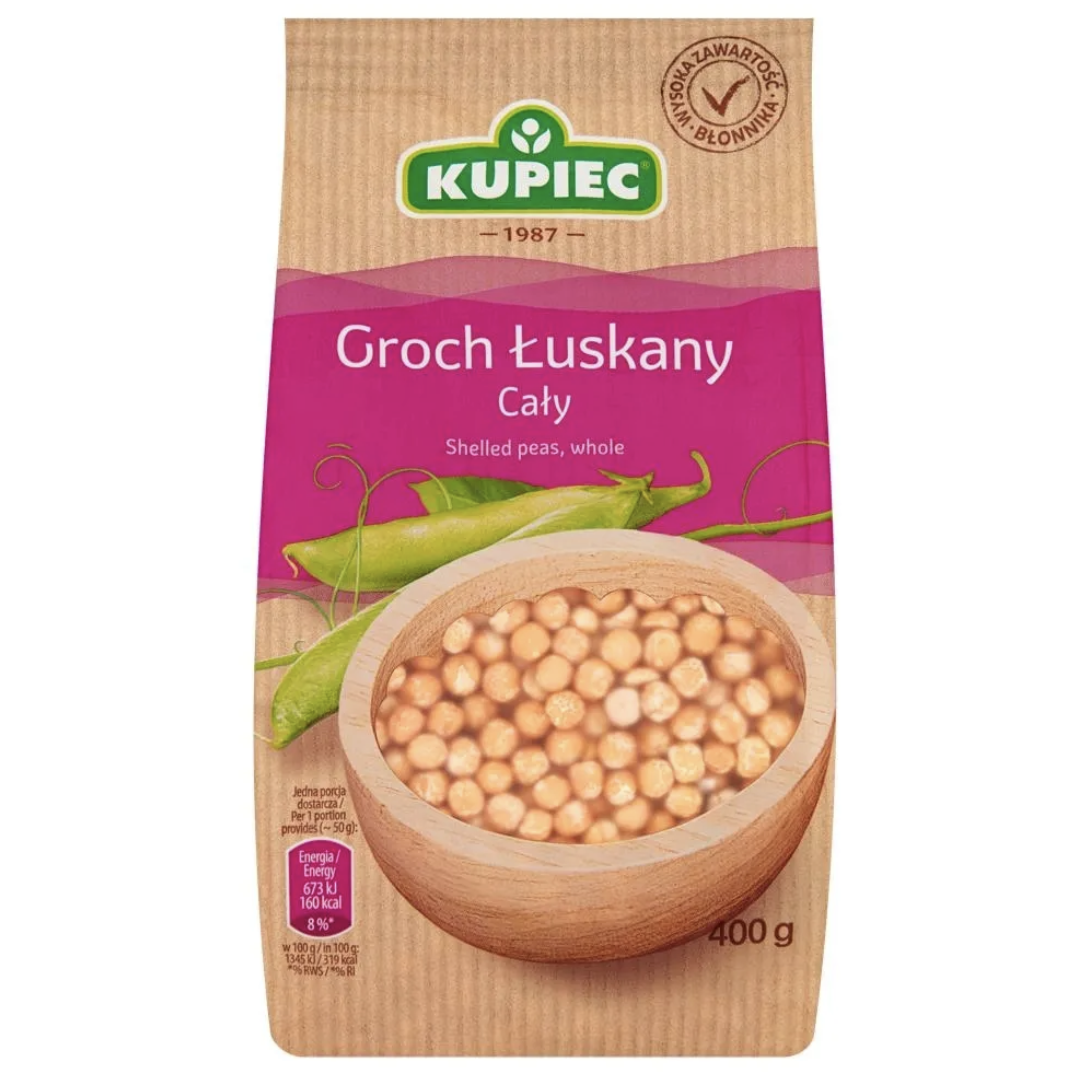 Wysokiej jakości groch łuskany cały marki Kupiec, idealny do przygotowania tradycyjnych zup, dań jednogarnkowych oraz potraw kuchni domowej. Naturalne źródło białka i błonnika, doskonały wybór dla osób ceniących proste i sycące składniki. Opakowanie 400 g.