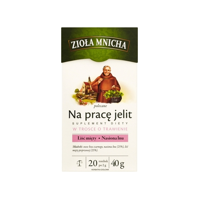 | Opis Dlugi | Linia Zioła Mnicha stworzona została z myślą o osobach ceniących tradycyjne składniki oraz polskie receptury. Zioła Mnicha polecane na pracę jelit to starannie dobrane składniki roślinne, które wspierają przewód pokarmowy. Dzięki znanym i cenionym składnikom wspomagają prawidłowe trawienie i pracę jelit. Len (Linum usitatissimum L.) zawiera substancje śluzowe, które powlekają przewód pokarmowy. Wspomaga regularną pracę jelit i pasaż jelitowy, przez co wspiera ich oczyszczanie. Korzystnie wpływa na prawidłowe trawienie. Liść mięty pieprzowej (Mentha piperita L.) wspomaga naturalne procesy trawienne i pracę jelit, przyczyniając się do prawidłowego funkcjonowania układu pokarmowego. Wykazuje właściwości rozkurczowe i wspomaga prawidłowe ruchy perystaltyczne jelit, dzięki czemu przyczynia się do usuwania uczucia pełności i wzdęć. |
