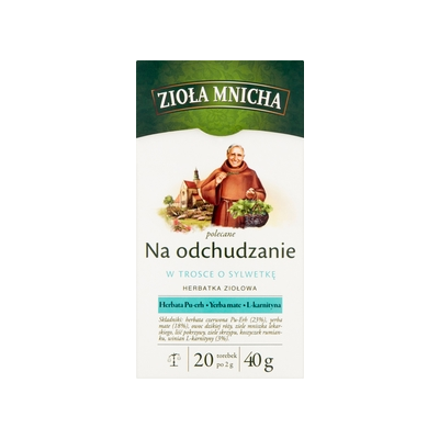 | Opis Dlugi | Zioła Mnicha polecane na odchudzanie to starannie dobrane składniki, które wspomagają metabolizm i spalanie tłuszczów, ułatwiając tym samym utrzymanie prawidłowej masy ciała. Herbata czerwona Pu-Erh (Camelia sinensis) - ta popularna i ceniona od lat herbata zawdzięcza swoje właściwości związkom powstałym w trakcie długotrwałego dojrzewania. Zachodzące w tym czasie procesy wpływają na jej charakterystyczny smak i wartości, które docenią zwłaszcza osoby dbające o sylwetkę. Yerba mate (Ilex paraguariensis) - korzystnie wpływa na metabolizm tłuszczów oraz ułatwia spalanie nagromadzonej w organizmie tkanki tłuszczowej, dzięki czemu wspomaga utrzymanie prawidłowej masy ciała. L-karnityna - znany składnik aktywny, szczególnie często wykorzystywany przez osoby prowadzące aktywny tryb życia. |