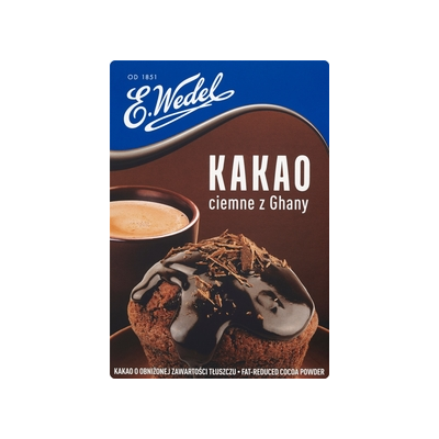 | Opis Dlugi | Wedlowskie kakao, powstałe z ziaren kakaowca pochodzących z Ghany. Ziarna kakaowca z Ghany są cenione ze względu na swoją wysoką jakość, a powstały z nich proszek kakaowy ma czekoladowy posmak. Doskonałe do picia, jak również do wypieków i wszelkiego rodzaju deserów. Nadaje potrawom wyjątkowy, nie zapomniany smak. Wypróbuj przepis, który znajduje się na opakowaniu lub wykorzystaj nasze ciemne kakao w swojej ulubionej recepturze! |