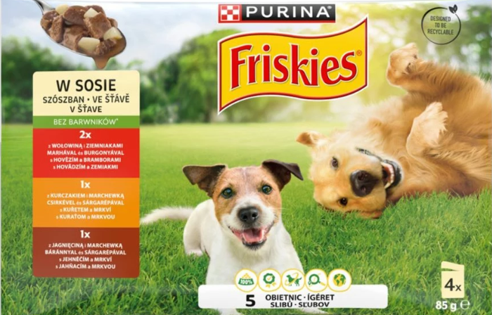 Karma dla psa Friskies Adult Mięso 4x85g (producent Nestle Purina) to pełnoporcjowa, mokra karma w saszetkach, dostępna w różnych wariantach smakowych (np. wołowina, kurczak, jagnięcina z warzywami w sosie lub galaretce)
