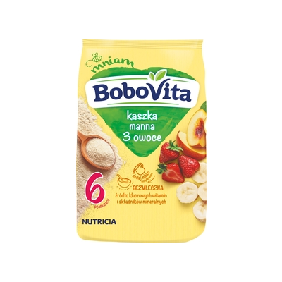 | Opis Dlugi | 1000 pierwszych dni 1000 pierwszych dni życia to wyjątkowy czas, w którym przez odpowiedni sposób żywienia możesz pozytywnie wpływać na zdrowie teraz i w przyszłości. Zadbaj o zdrowie i rozwój dziecka, zapewniając mu urozmaiconą i zbilansowaną dietę, złożoną z najwyższej jakości produktów odpowiednich do wieku i potrzeb. nasza obietnica... Nasze kaszki BoboVita odpowiadają na szczególne potrzeby żywieniowe Twojego dziecka. Z nimi każda chwila ma pyszny smak, a Ty możesz się cieszyć radosnym „Mniam"! Kaszka manna 3 owoce została starannie skomponowana tak, by zawierała to, co dobre dla Twojego dziecka: zboża - kasza manna, ważny składnik zbilansowanego jadłospisu + owoce - pyszny smak truskawek, bananów i brzoskwiń Źródło kluczowych witamin i składników mineralnych Wit. B1 (tiamina)* dla prawidłowego metabolizmu energetycznego i układu nerwowego Żelazo i Wit. C dla układu odpornościowego Wapń i Wit. D* dla prawidłowego rozwoju kości Czy wiesz, że... Normy jakości i bezpieczeństwa wobec naszych zbóż są nawet do 1000 razy bardziej surowe niż dla zbóż dla dorosłych.* * dotyczy norm dla pestycydów w zbożach gwarantujemy!!! Nasze kaszki BoboVita to gwarancja jakości i bezpieczeństwa. Jesteśmy tego pewni, bo znamy je od ziarenka po gotowy, pyszny produkt! Ty też możesz być pewna, że zboża i owoce w kaszkach pochodzą wyłącznie ze starannie wybranych, skontrolowanych pól i sadów, a wszystkie produkty spełniają rygorystyczne normy jakościowe żywności dla najmłodszych. To dla nas naturalne, aby w kaszkach BoboVita nie znalazły się zbędne substancje: Bez konserwantów* Bez barwników i wzmacniaczy smaku* Bez GMO (składników modyfikowanych genetycznie)** * zgodnie z przepisami prawa ** podobnie jak wszystkie inne produkty dla niemowląt i małych dzieci na rynku polskim Produkt dla niemowląt i małych dzieci. |