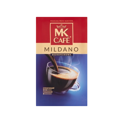 | Opis Dlugi | Szlachetna kompozycja MK Cafe Mildano to suma wiedzy i doświadczeń najlepszych baristów. Kawa bezkofeinowa. Idealna dla wszystkich tych, którzy chcą cieszyć się smakiem prawdziwej kawy o dowolnej porze dnia, także wieczorem. W pełnym smaku MK Cafe Mildano, bariści wyczuwają nuty kakao, toffi i cukru trzcinowego. |