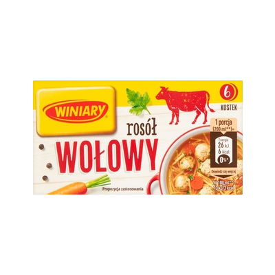 | Opis Dlugi | Rosół Wołowy Winiary to idealny sposób na podkreślenie smaku i aromatu domowych zup oraz ulubionych potraw. Dzięki niemu masz pewność, że danie będzie smakowało Tobie i Twojej rodzinie. Możesz wykorzystać go zarówno do podkreślenia smaku zup i sosów, jak również do doprawienia innych potraw. Aby uzyskać esencjonalny bulion wołowy rozpuść 2 kostki w 1 litrze wrzącej wody, a do podkreślenia smaku użyj jedynie 1 kostkę na 1 litr płynu. Przy użyciu kostki bulionowej większość dań nie wymaga dosalania, dzięki czemu masz pewność, że danie będzie udane i smaczne. Rosół Wołowy Winiary to: - gwarancja, że danie zawsze się uda - idealnie przyprawione danie - znany i lubiany smak - prosty i szybki sposób na podkreślenie smaku i aromatu przygotowywanej potrawy - dostępny jest w różnych wielkościach opakowań: 6, 12 i 18 kostek |