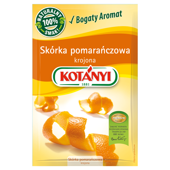 Skórka pomarańczowa Kotányi posiada delikatny, słodko-gorzki smak i owocowy aromat. Jest gotowa do spożycia. Uwalnia swój aromat w kontakcie z płynami. Gotowana, nadaje potrawom egzotyczny smak.