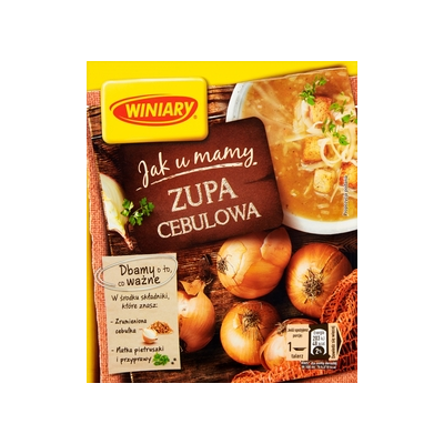 | Opis Dlugi | Winiary Zupa cebulowa Jak u mamy to pyszna zupa cebulowa, którą przyrządzisz bez łez, bo cebulkę pokroiliśmy i zrumieniliśmy za Ciebie. Podsmażona cebulka i odpowiednio dobrane przyprawy to sekret głębokiego smaku naszej Zupy cebulowej. Zupę cebulową Winiary Jak u mamy możesz przyrządzić na wiele sposobów - podać ją z pieczonymi kiełbaskami, ciągnącym camembertem lub grzankami. Co ciekawe, dzięki dużej zawartości cebuli i przypraw, nasza Zupa cebulowa może także pomóc przyrządzać drugie dania! Spróbuj dodać ją do kotletów mielonych lub upiec z nią babkę ziemniaczaną. Przepisów szukaj na winiary.pl. Winiary Jak u mamy Zupa cebulowa: - To aromatyczna zupa cebulowa z drobno pokrojoną, zrumienioną cebulką - Zawiera składniki, które znasz- dużo cebuli i dobrane do niej przyprawy - Świetnie smakuje z różnymi dodatkami, jak kiełbaski, grzanki czy ser camembert - Może być używana również do wzmocnienia smaku drugich dań, np. kotletów mielonych |