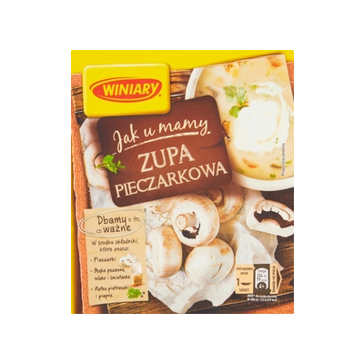 | Opis Dlugi | Zupa pieczarkowa Winiary Jak u mamy to aromatyczna zupa o kremowej konsystencji, doskonała jako propozycja na rodzinny obiad - na co dzień i od święta. Zawiera suszone pieczarki, śmietankę, jest doprawiona pieprzem i natką pietruszki. Zupa pieczarkowa Winiary Jak u mamy to łatwy sposób na ugotowanie zupy pieczarkowej - nie trzeba obierać i kroić pieczarek, wszystko co potrzebne, jest już w torebce. Zupa pieczarkowa Winiary Jak u mamy świetnie też smakuje podawana z różnymi dodatkami, które podnoszą jej smak i wartości odżywcze. Możesz posypać ją np. grzankami, dodać ugotowane ziemniaki lub makaron, a także podać z gołąbkami z kaszą (przepis na winiary.pl). Winiary Jak u Mamy Zupa pieczarkowa: - Zawiera suszone pieczarki i dodatek śmietanki, jest doprawiona pieprzem i natką pietruszki - Jest dobrym pomysłem na łatwy w przygotowaniu rodzinny obiad - Świetnie smakuje podawana z różnymi dodatkami, takimi jak np. grzanki, ziemniaki lub makaron albo gołąbki z kaszą (przepis na winiary.pl) |