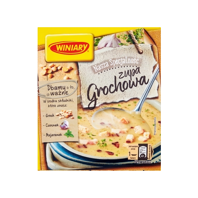 | Opis Dlugi | Zupa grochowa to jedna z najpopularniejszych, szczególnie lubianych w Polsce zup. Gęsta, aromatyczna i pożywna jest świetnym sposobem na podanie rodzinie rozgrzewającego, pysznego posiłku. Tę zupę łatwo urozmaicić i wzbogacić rodzinne posiłki podając ją z ulubionymi dodatkami, np. ziemniakami, chrupiącym podsmażonym boczkiem, grzankami. Zupa grochowa Winiary to prosty i wygodny pomysł na przygotowanie pysznej grochowej w domu. Naszą grochową przygotowaliśmy ze składników, które dobrze znasz. Zawiera ponad 60% suszonego grochu, a oprócz tego suszone warzywa, zioła i przyprawy. W Winiary dbamy o to, co ważne - dobre składniki w naszych produktach. Dlatego zupa grochowa Nasza Specjalność zawiera groch pochodzący z Polski, z województwa świętokrzyskiego. Winiary Zupa grochowa Nasza Specjalność: - To grochowa o wyrazistym smaku, doprawiona cebulą, czosnkiem i majerankiem - Ma gęstą, aksamitną konsystencję - Powstaje z grochu uprawianego w Świętokrzyskiem - Może być podawana na wiele sposobów, np. ziemniakami, chrupiącym podsmażonym boczkiem, grzankami. |