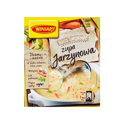 | Opis Dlugi | Zupa jarzynowa to typowa dla polskiej kuchni zupa, idealna na tradycyjny domowy obiad dla całej rodziny. W Zupie jarzynowej Nasza specjalność Winiary znajdziesz składniki, które znasz ze swojej kuchni: suszone warzywa takie jak marchew, cebula, seler, pasternak, ziemniaki, a także przyprawy i natkę pietruszki. Nasza jarzynowa ma przyjemną, delikatną konsystencję. Zupa jarzynowa Winiary Nasza Specjalność to doskonały sposób na przemycenie różnorodnych warzyw do codziennych obiadów. Idealnie skomponowana receptura Zupy jarzynowej Winiary Nasza Specjalność może być doskonałą bazą dla Twojej domowej jarzynowej - możesz dodać według swoich upodobań świeże warzywa, takie jak np. marchewka, ziemniaki, cukinia czy fasolka szparagowa. Winiary Nasza Specjalność Zupa jarzynowa: - To świetny pomysł na obiad dla rodziny - Zawiera suszone warzywa - Stanowi pyszną bazę do ugotowania domowej jarzynowej |